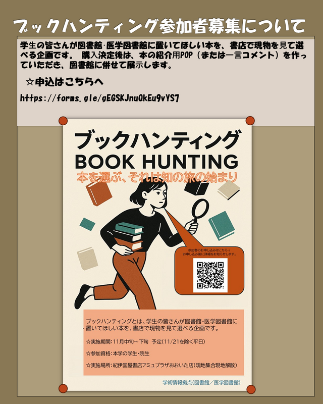 学⽣の皆さんが図書館‧医学図書館に置いてほしい本を、書店で現物を⾒て選べる企画です。 購⼊決定後は、本の紹介⽤POP(または⼀⾔コメント)を作っていただき、図書館に併せて展⽰します。