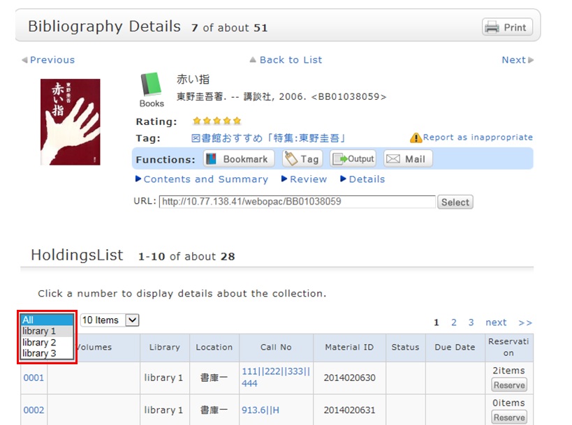 Suppose that you perform a refined search of a holding library, select a bibliography on the bibliography search result list screen, and then move to the bibliography details screen. Even after that, you can still cancel the refined search of the holding library and perform a refined search of another library.