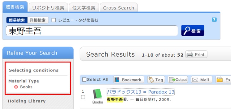 Cancel the search conditions for this holding library. Then, to return to the original search result list, click the red x button in the blank area under "Selecting conditions."