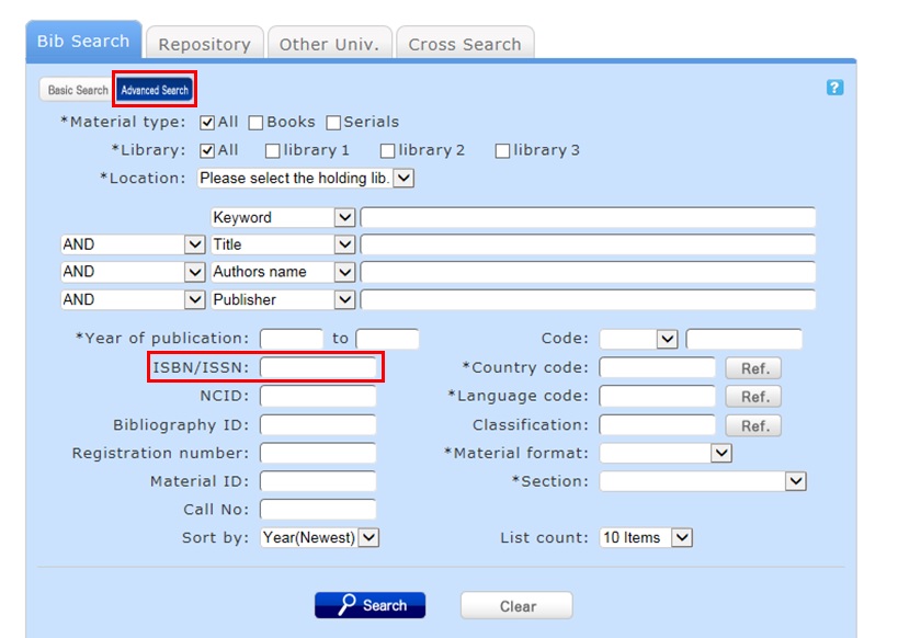 You can also perform a search from the advanced search screen by clicking the [Advanced Search] button on the [Bib Search] tab.