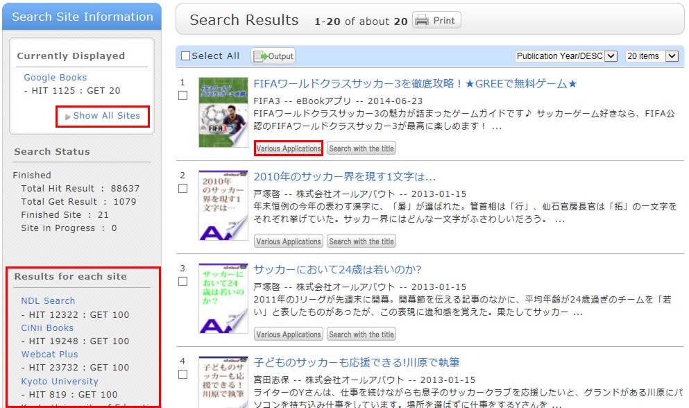 - You can display a list of search results of each specific search site by clicking "Show All Sites" at the top left of the screen or clicking the site link in the results for each site on the left side of the screen.