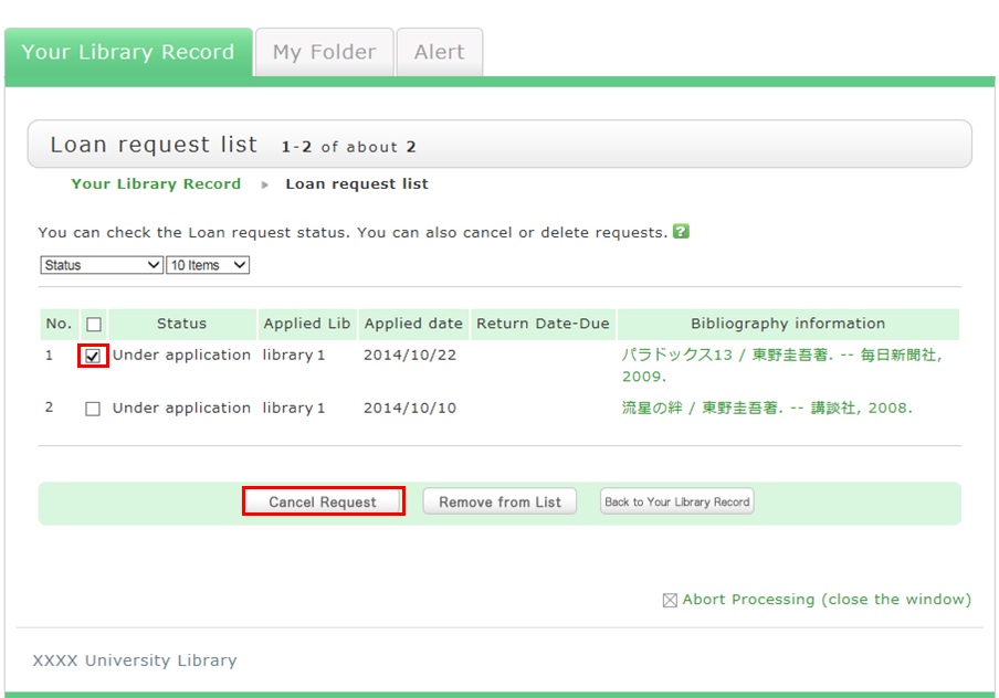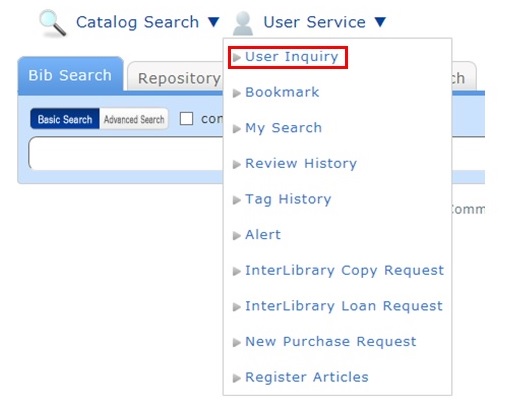You can confirm your loaned out materials and various requested materials on the user inquiry screen.