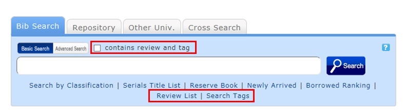 - In [Basic Search] on the [Bib Search] tab, enter a check mark for "Contains review and tag."