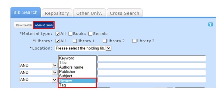 - In [Advanced Search] on the [Bib Search] tab, select "Review" or "Tag" from the pull-down menu and search the materials.
