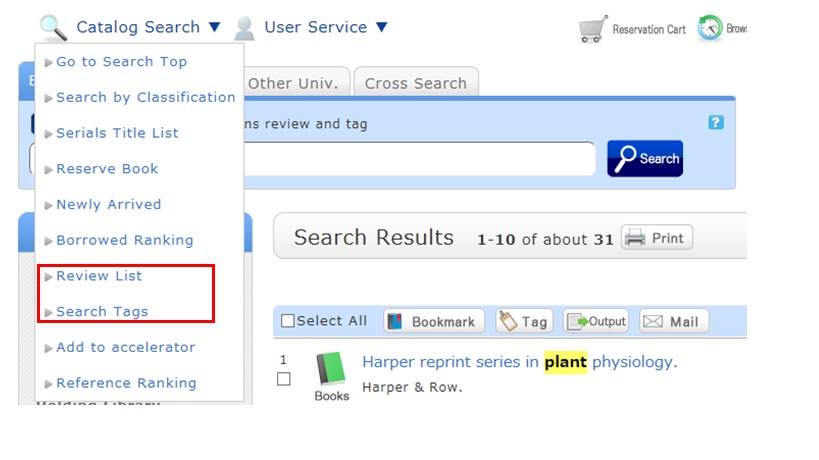 - Select "Review List" or "Search Tags" from the catalog search menu.